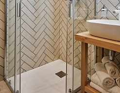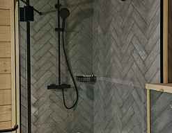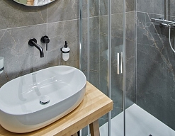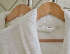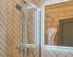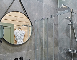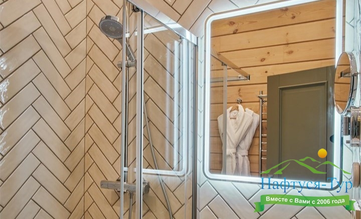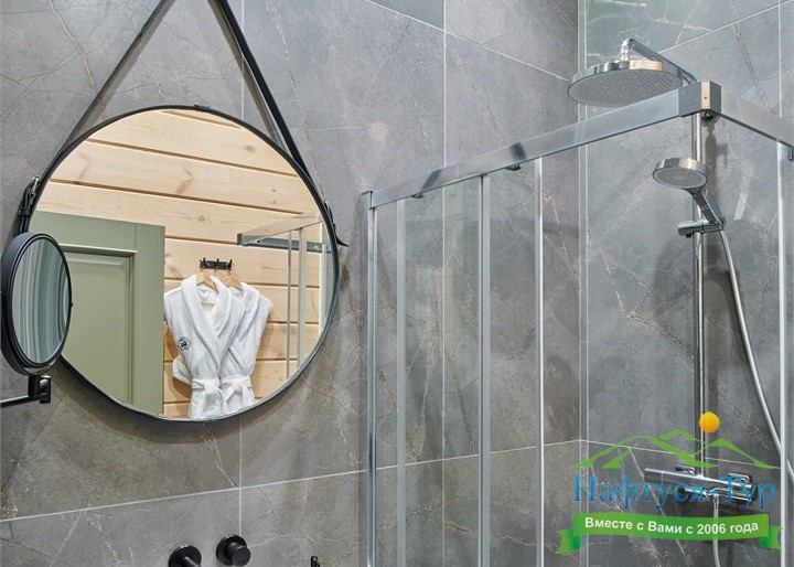 с душевой кабиной, тапочки, туалетные принадлежности, фен, халат