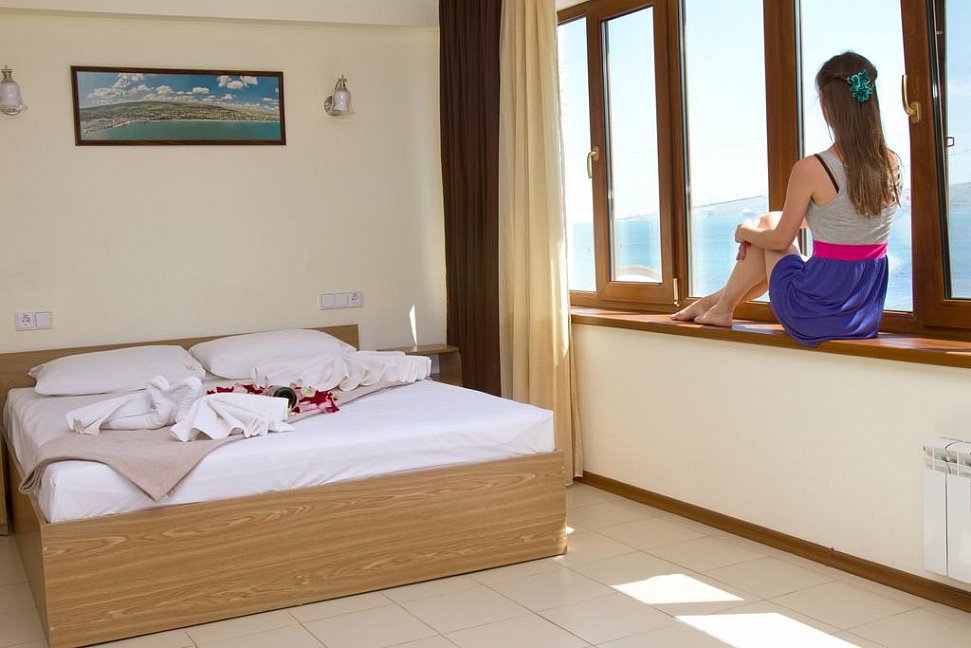 Самолетом до аэропорта г.Симферополь, далее из аэропорта маршрутным такси или от автостанция "Курортная" рейсовым автобусом до автовокзала г.Феодосия, далее пешком до отеля 800 м (через железнодорожный мост) или на такси