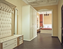 вешалка, диван, зеркало, кровать двуспальная, прикроватные тумбочки, стол, стул, шкаф