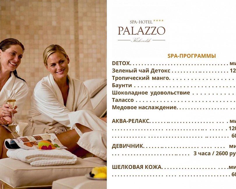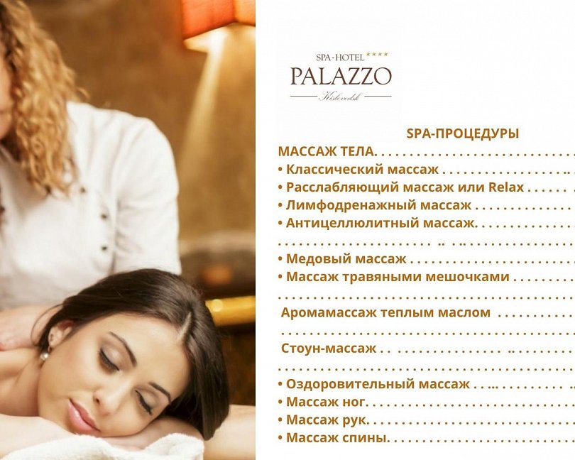 Spa отель Палаццо предлагает нашим гостям большое количество Spa услуг, крытый подогреваемый бассейн и баню на дровах.