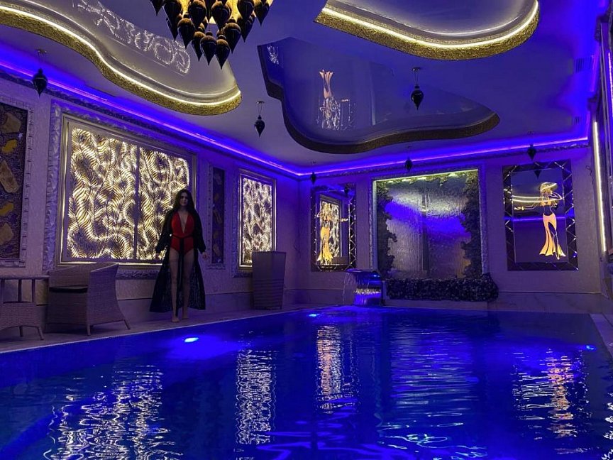 Бассейн с противотоком,водопадом,гидромассажем и аэромассажем.