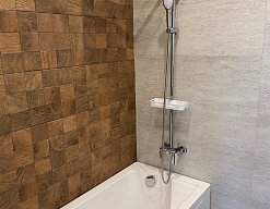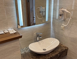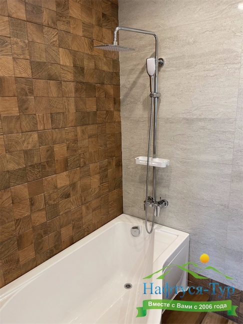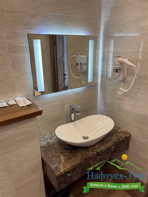 с ванной или душевой кабиной, тапочки, туалетные принадлежности, фен
