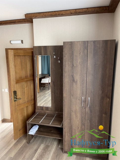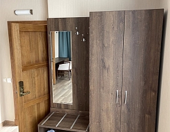 вешалка, зеркало, кровати односпальные /одна двуспальная кровать, прикроватные тумбочки, стол, стул, шкаф