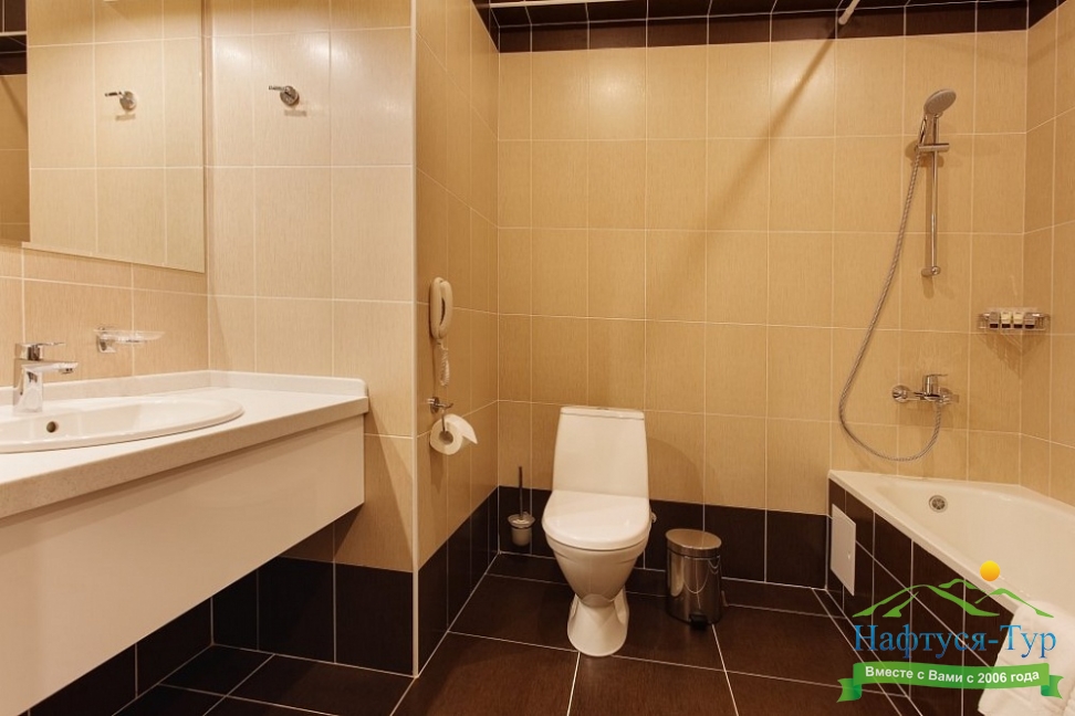 с душем или ванной, тапочки, туалетные принадлежности, фен