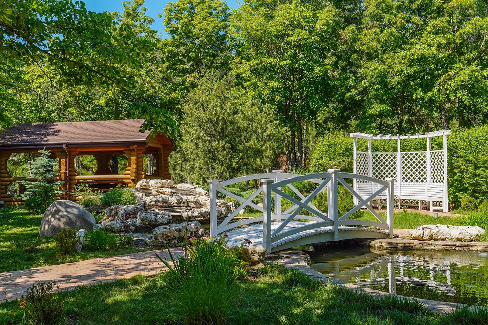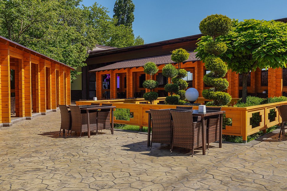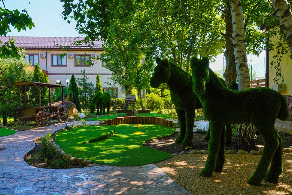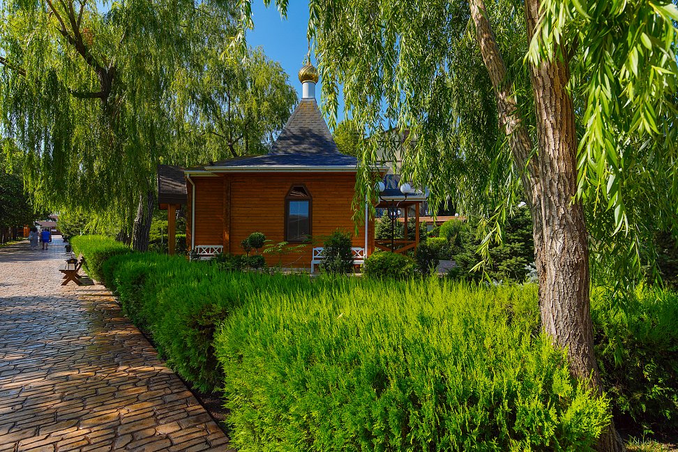 - благоустроенная зеленая территория с платанами, плодовыми деревьями и цветниками