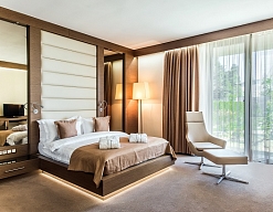 кресло, кровать двуспальная, прикроватные тумбочки, стол, стулья