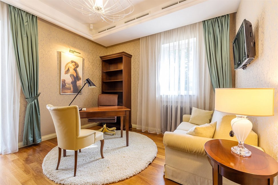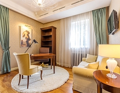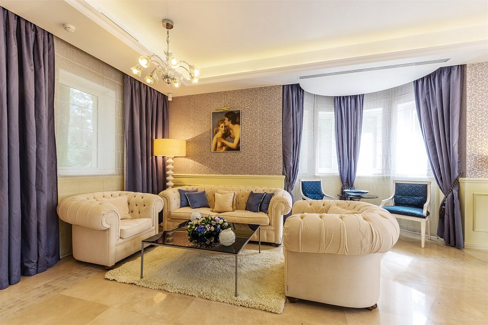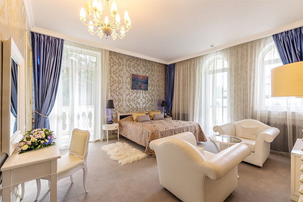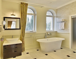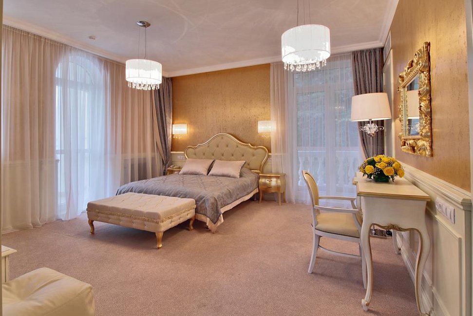 В комфорте виллы “Золотая” предусмотрено все, что только могут пожелать ценители истинной роскоши. Красоту интерьера подчеркивает камин из итальянского мрамора «Микеланджело», элегантный текстиль, зеркала в деревянной рамке с золотой отделкой, и элитная сантехника c покрытием из 24-х каратного золота.