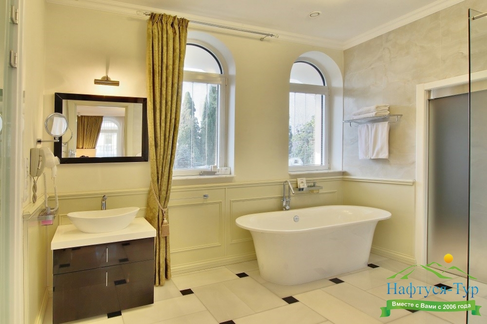 3 санузла, биде, с ванной, с душевой кабиной, тапочки, туалетные принадлежности, фен, халат