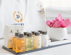 с душем, тапочки, туалетные принадлежности, фен, халат