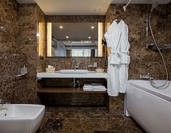 с ванной, тапочки, туалетные принадлежности, фен, халат