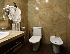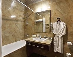с душевой кабиной, тапочки, туалетные принадлежности, фен, халат