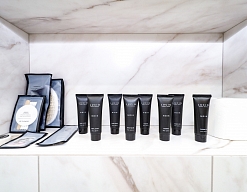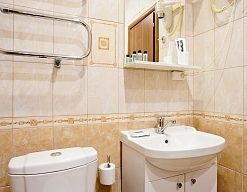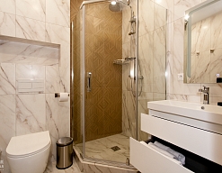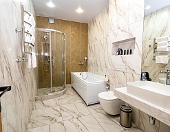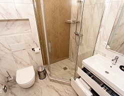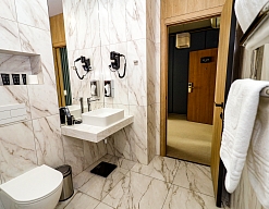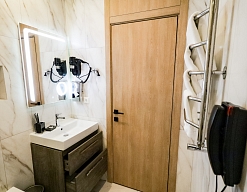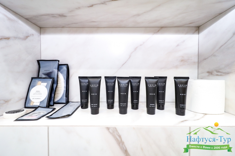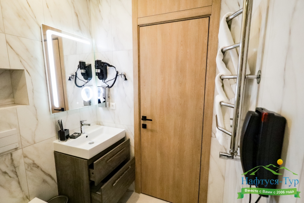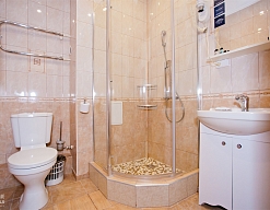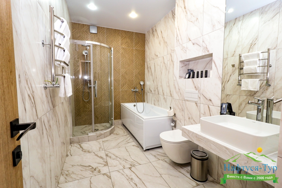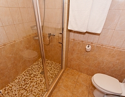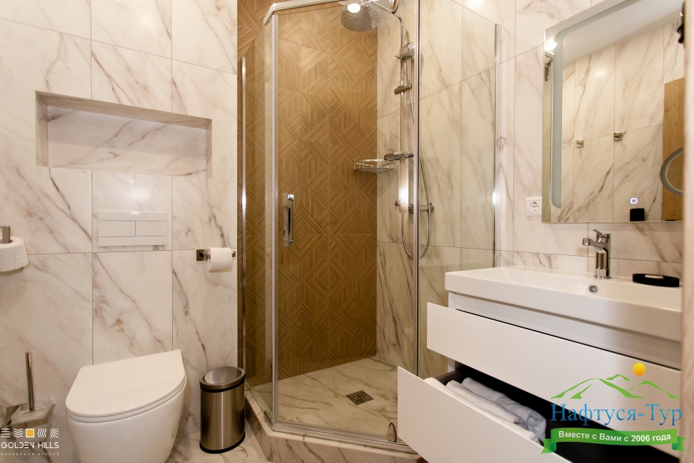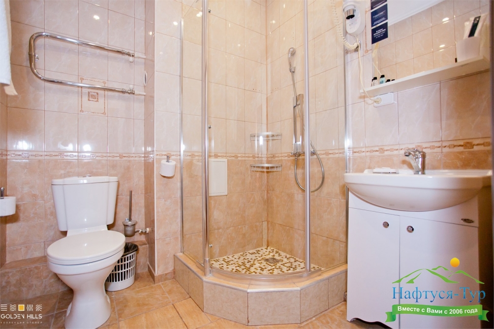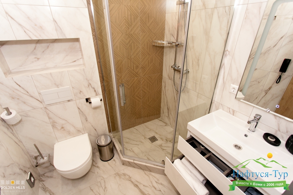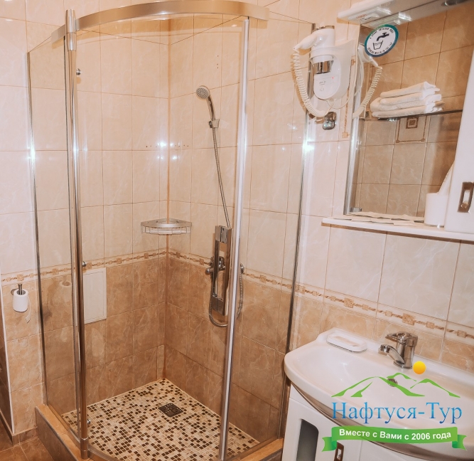 с душевой кабиной, тапочки, туалетные принадлежности, фен, халат