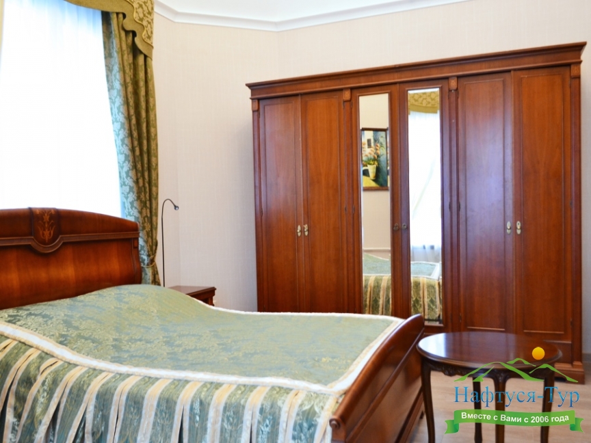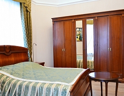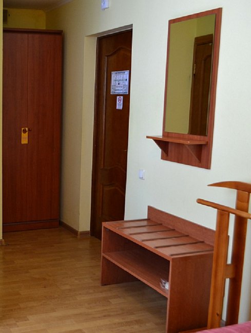 вешалка, диван, зеркало, кровати односпальные /одна двуспальная кровать, прикроватная тумбочка, стол, стулья, шкаф