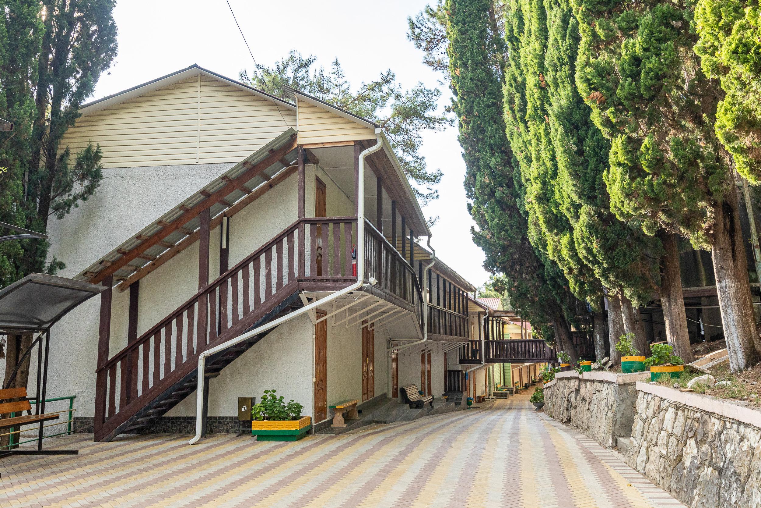 Пансионат состоит из 64 двухместных 2х – этажных уютных семейных коттеджей в европейском стиле, которые выстроились в ряд на утопающей в зелени территории, расположенной всего 10 м от Черноморского побережья.