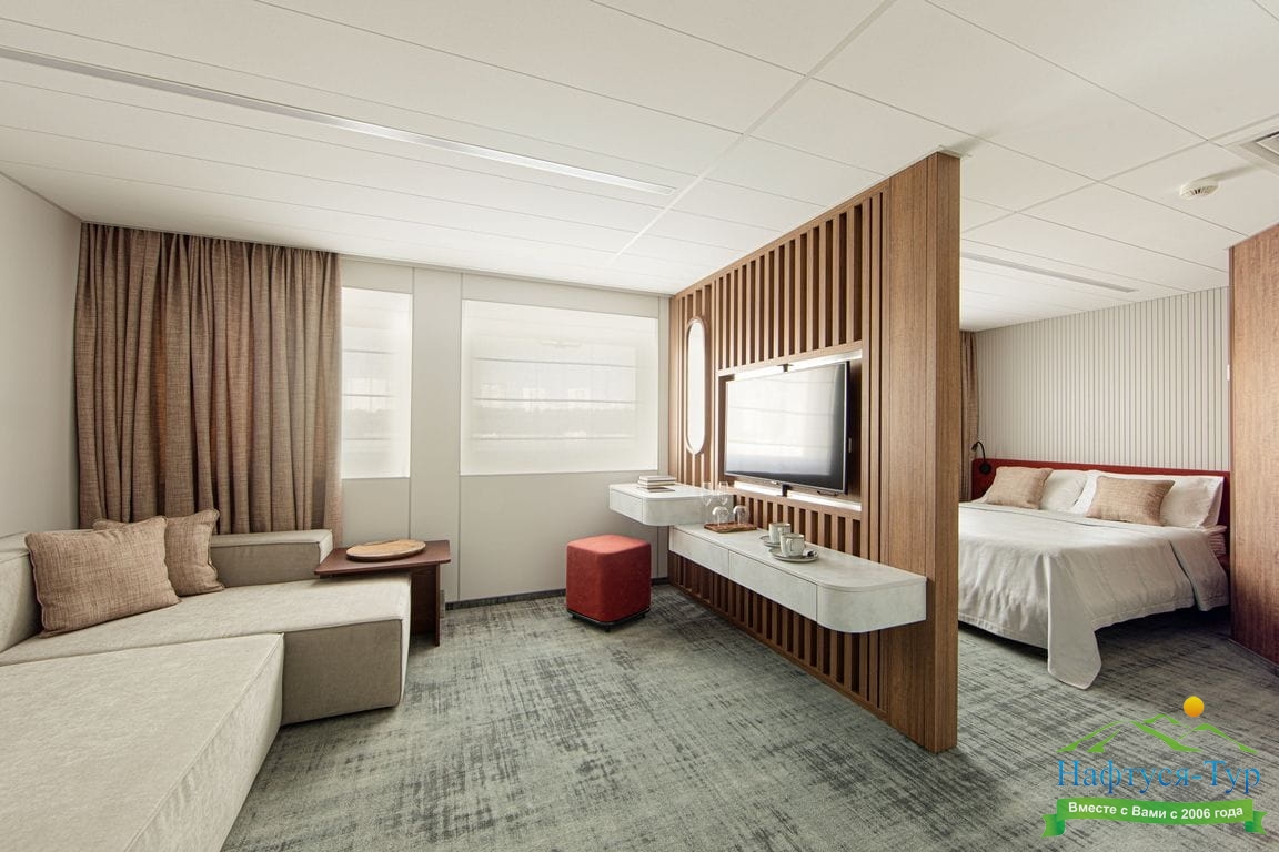 В каюте: двуспальная кровать, шкаф для одежды, сейф, телевизор, холодильник, радио, обзорное окно, душ, санузел, кондиционер, фен, электророзетка на 220V. Площадь каюты до 14,32 м2.