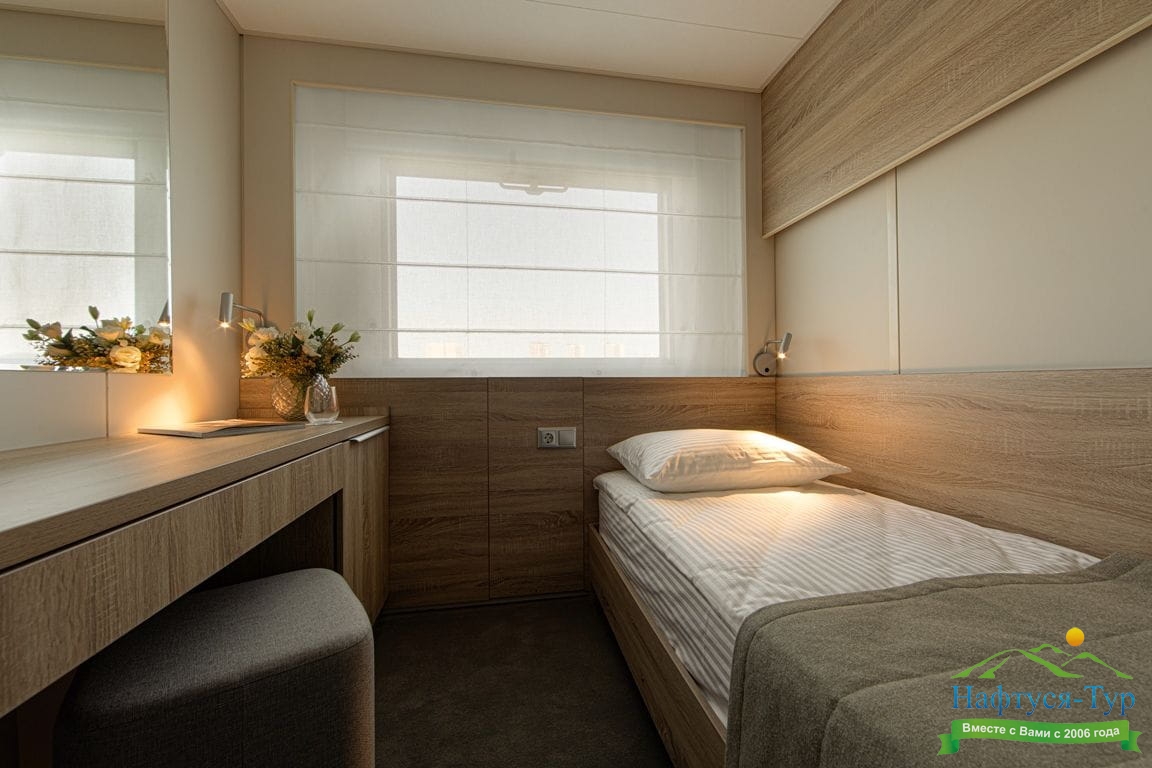 В каюте: одно спальное место, шкаф для одежды, радио, кондиционер, душ, санузел, холодильник, телевизор, фен, обзорное окно, электророзетка на 220V, площадь каюты до 7,7 м2.