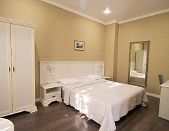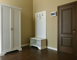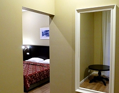 вешалка, диван, зеркало, кровать двуспальная, прикроватные тумбочки, стол, стул, шкаф