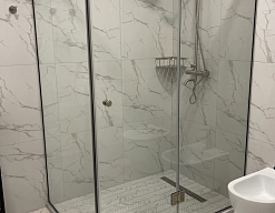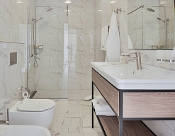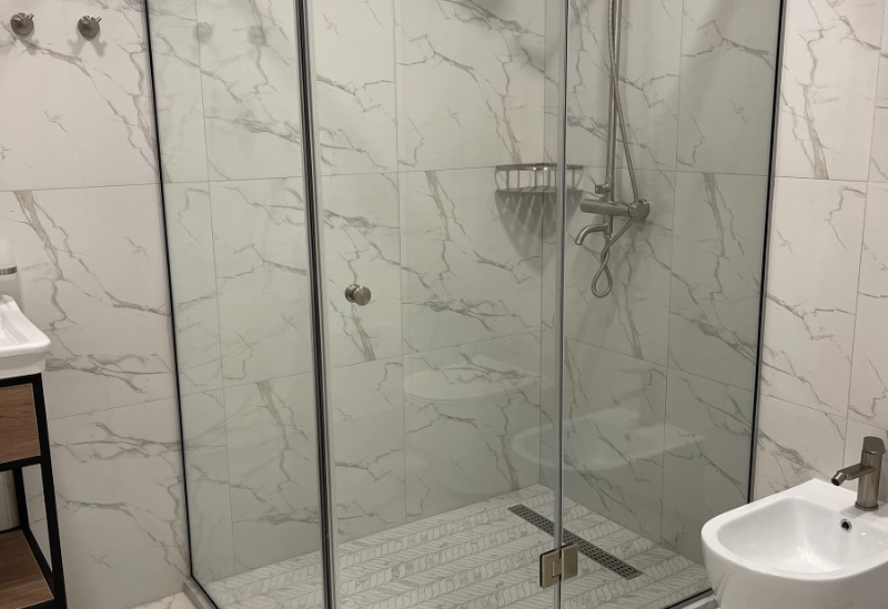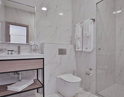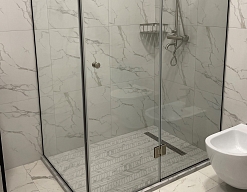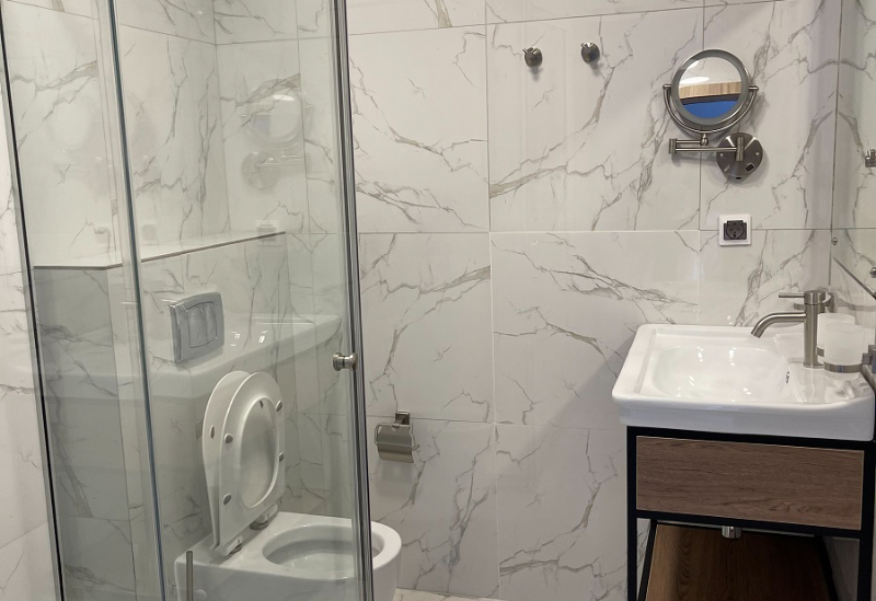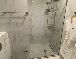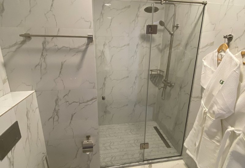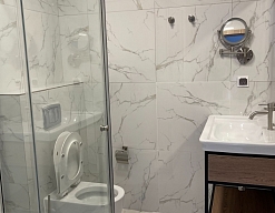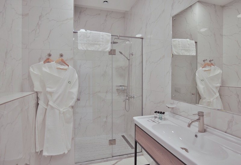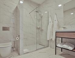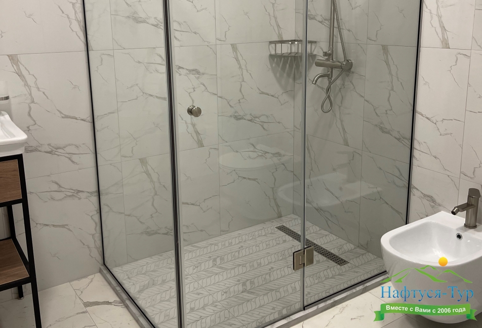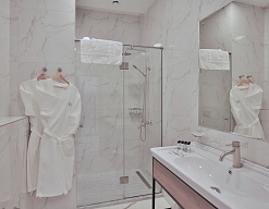 с душевой кабиной, тапочки, туалетные принадлежности, фен, халат
