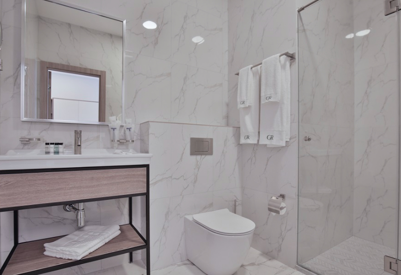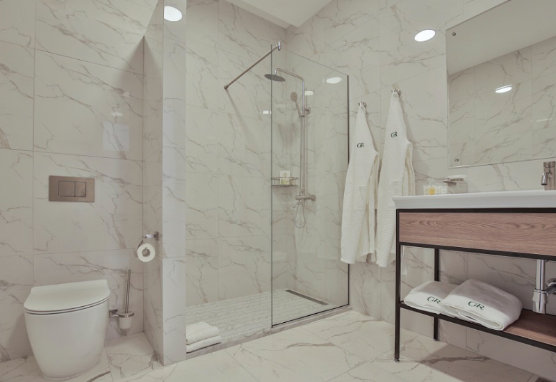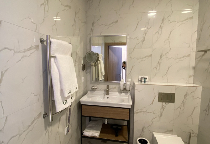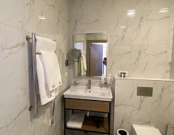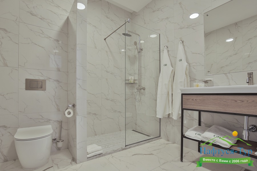 с душем, тапочки, туалетные принадлежности, фен, халат