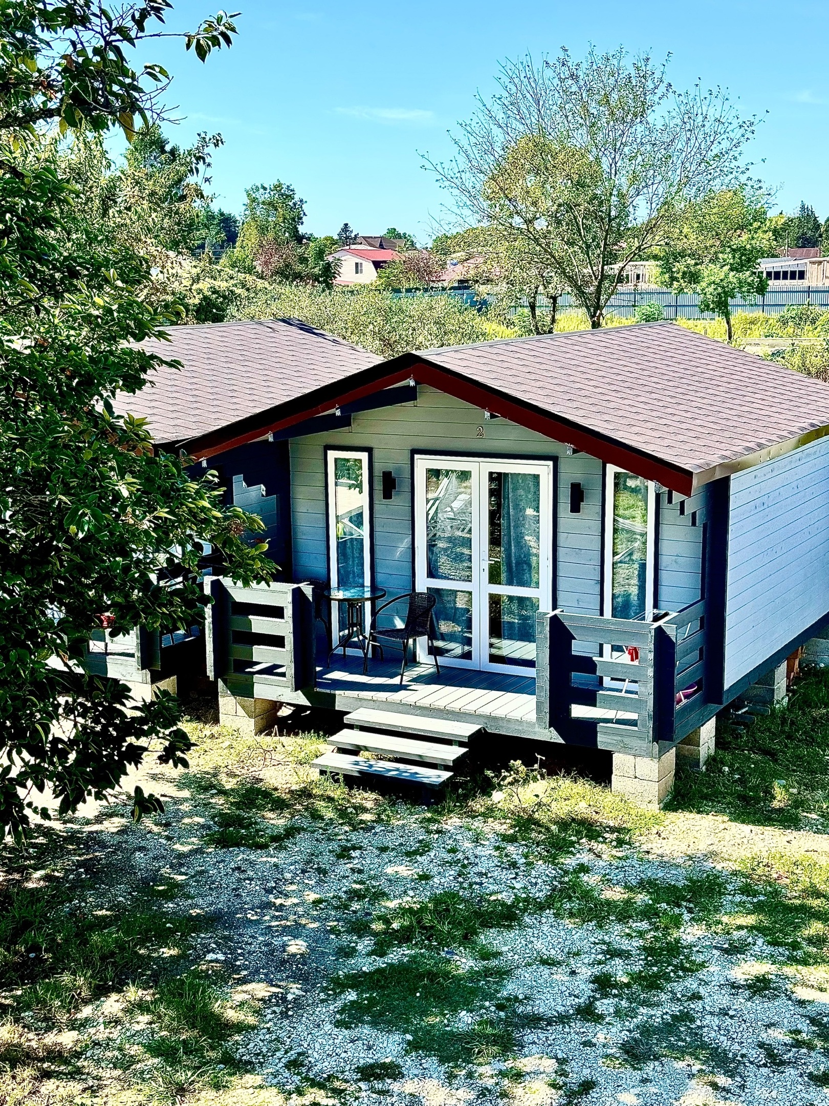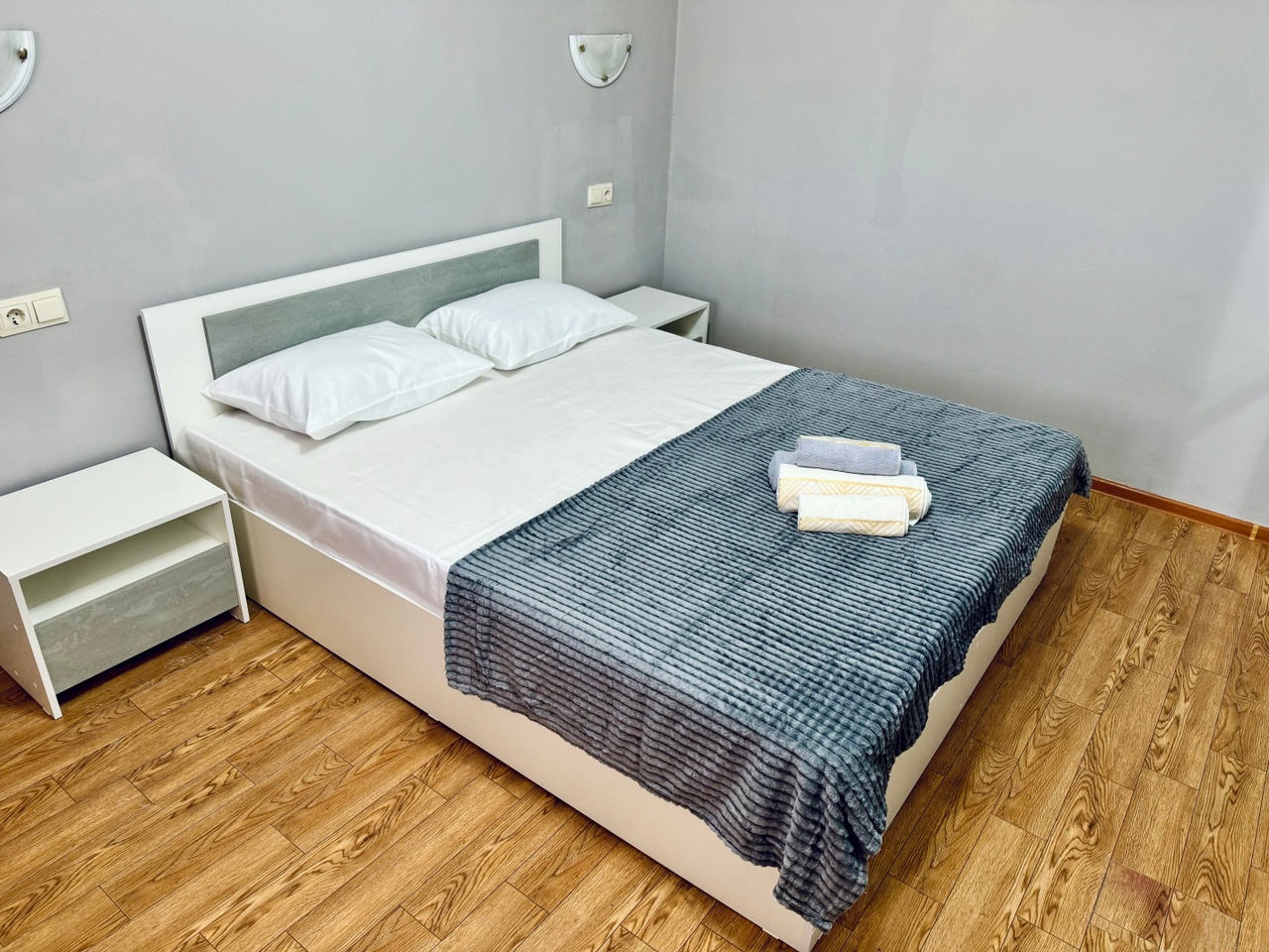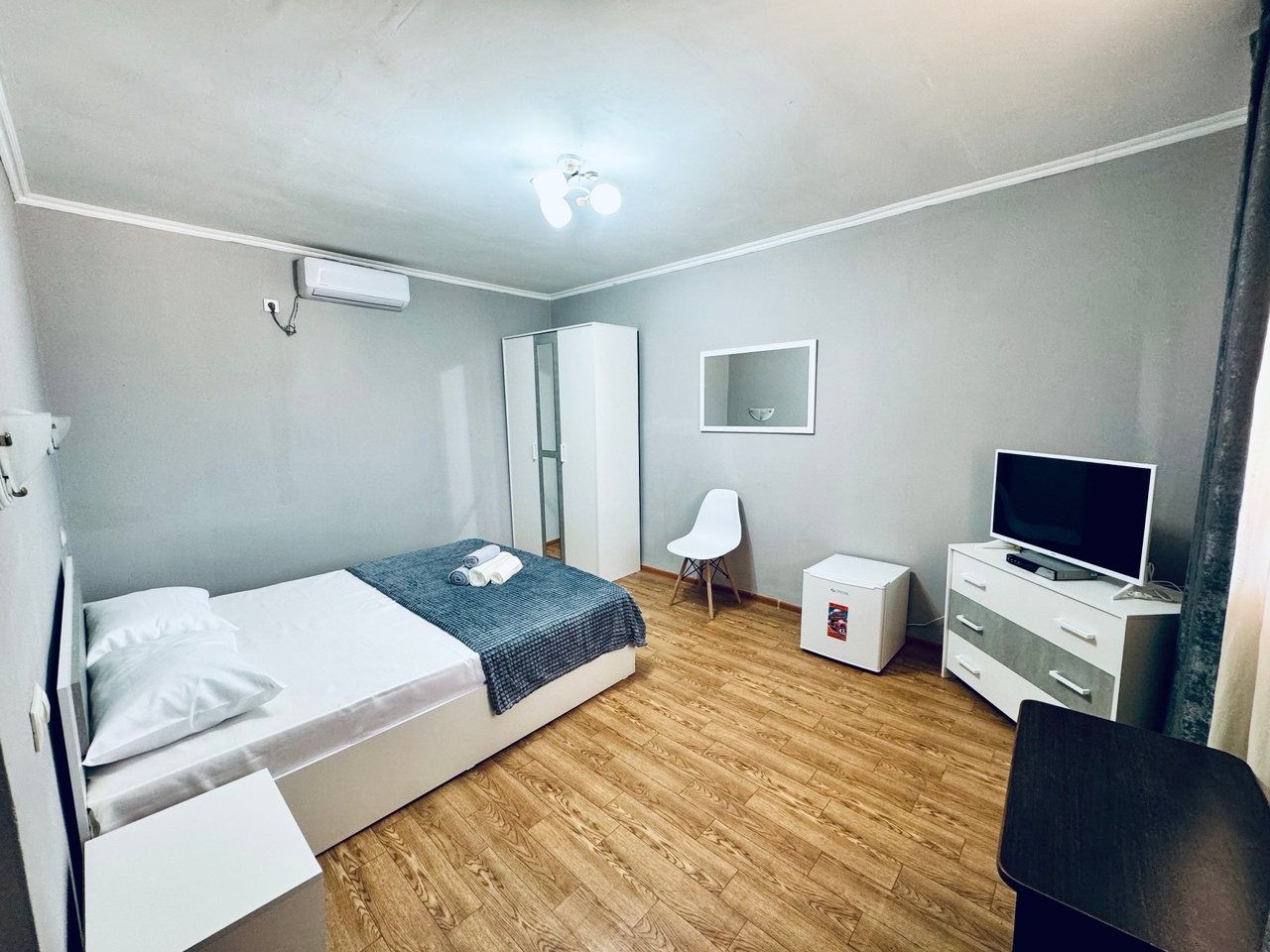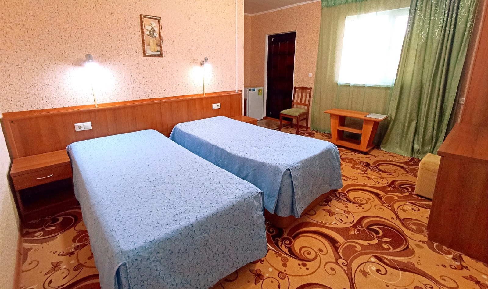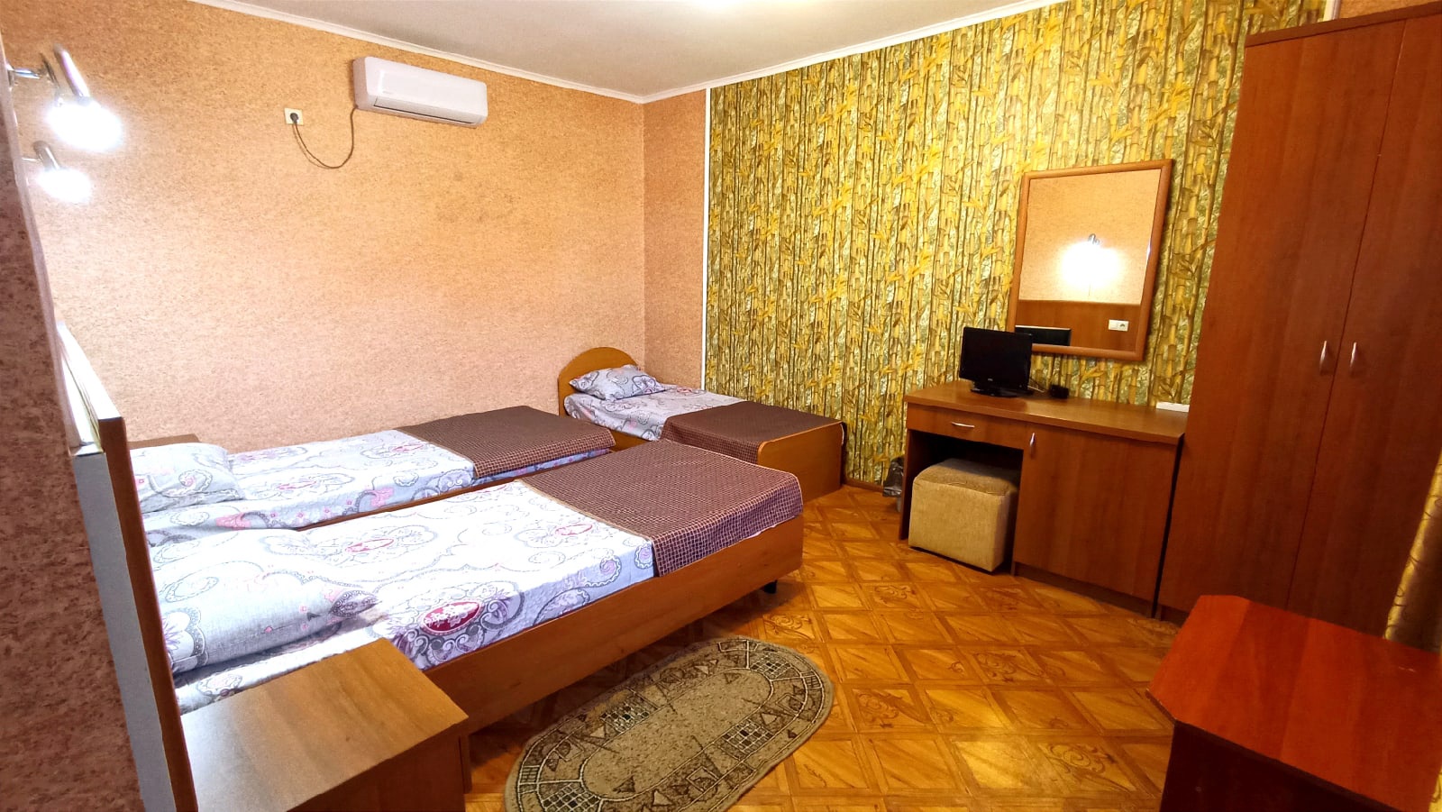 Номера: 2-х, 3-х местные 1- комнатные (25 м2), с удобствами в номерах (душ, умывальник, туалет). Набор необходимой мебели: кровати, тумбочки, платяной шкаф, стол, стулья. В номере: холодильник, ТВ, кондиционер. В каждый номер отдельный вход.