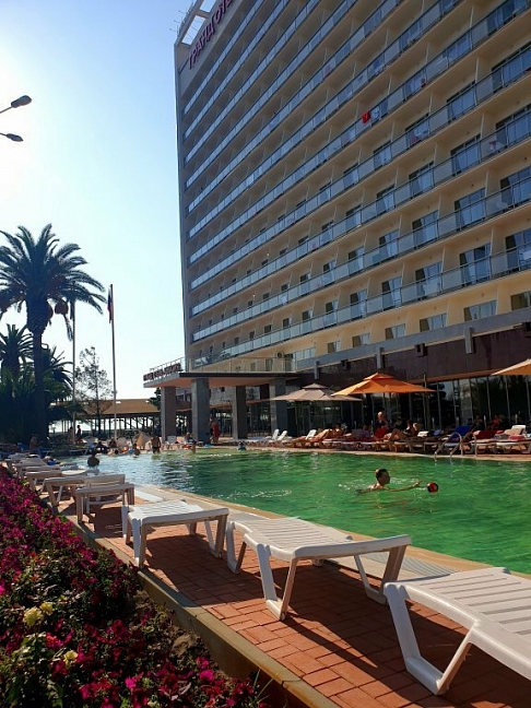 Отдыхали с 10 по 17.09. номер стандарт на 3 чел. Заселили на 10 этаж, шикарный вид на море. 2х спальная кровать с одним одеялом, по просьбе предоставили одеяло без пододеяльника ( он не положен для нас). Доп место, раскладушка (оплачивали еще кровать). Постельное бельё за 7 дней не сменили ни разу. Питание хорошее, со столов убирали за собой сами. Море в 50 метрах. Бассейн с подогревом.