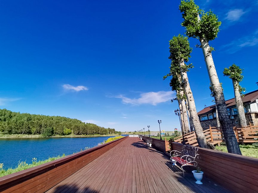 Поездом до ж/д вокзала г. Бийска, далее с автовокзала на междугороднем автобусе №565 до «Село Старобелокуриха» (школа), далее 1,9 км до апарт-отеля.