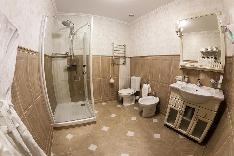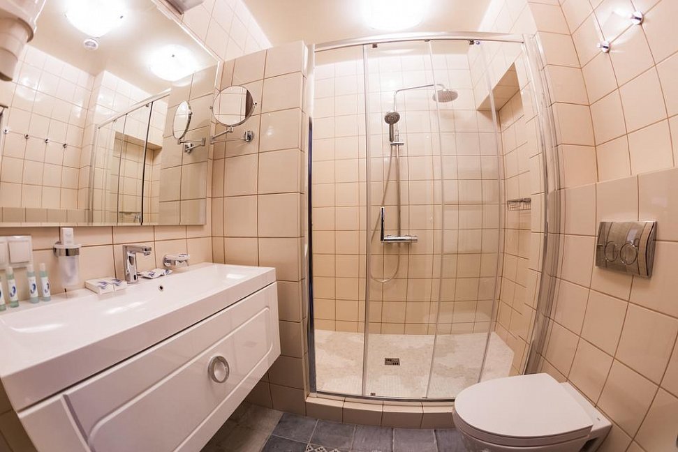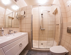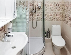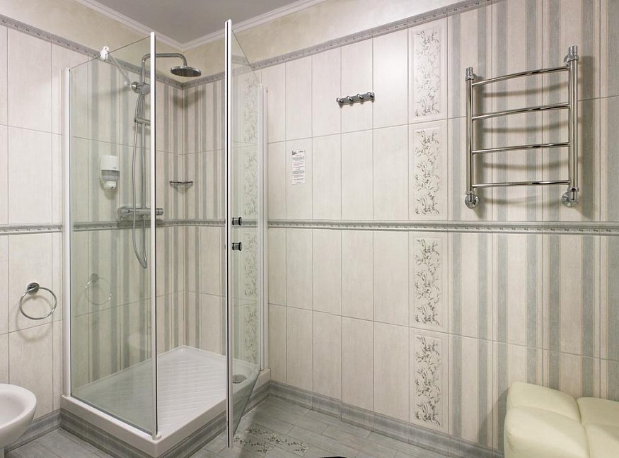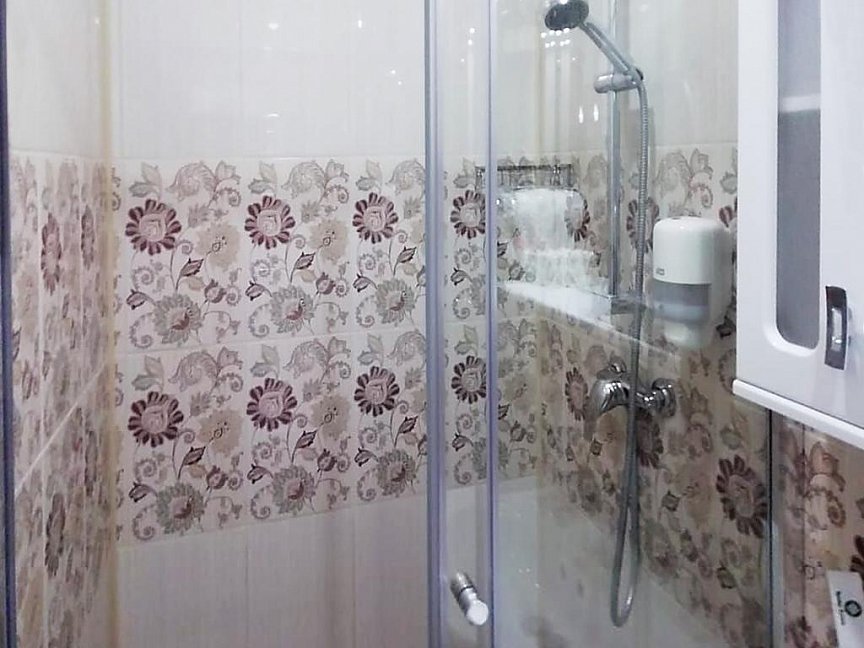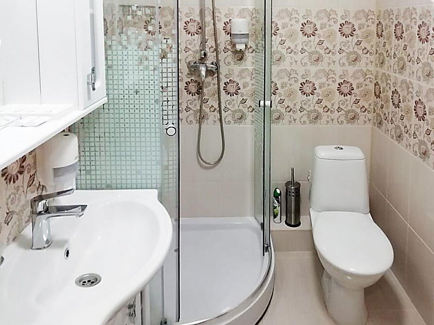с душевой кабиной, тапочки, туалетные принадлежности