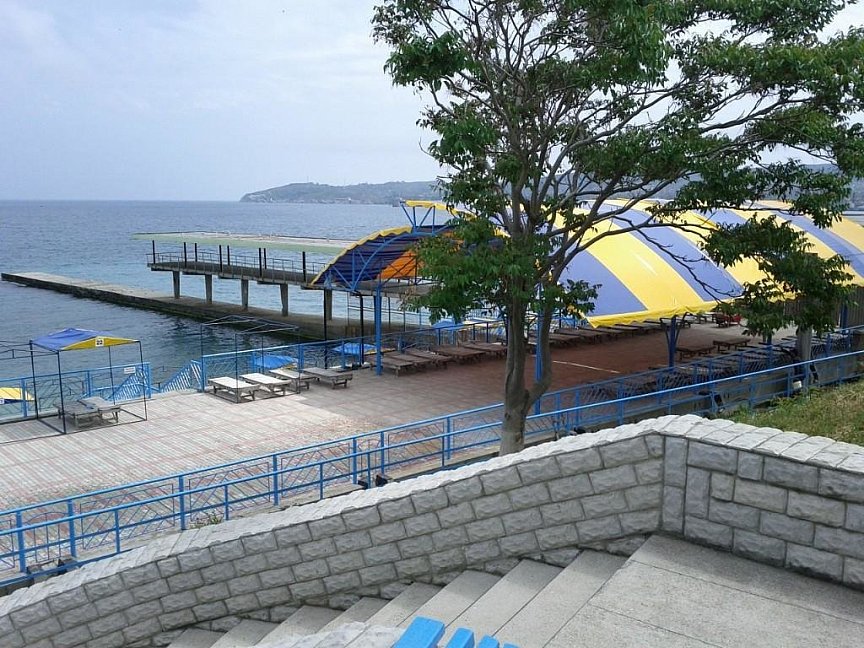 До моря - 500 м. Это не в гору и не очень далеко и пляж действительно пансионата, но это не первая линия и вход в воду через большие острые камни, поэтому покупайте тапочки закрывающие все стопы - 300 руб. на ближайшем рынке.