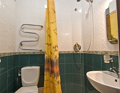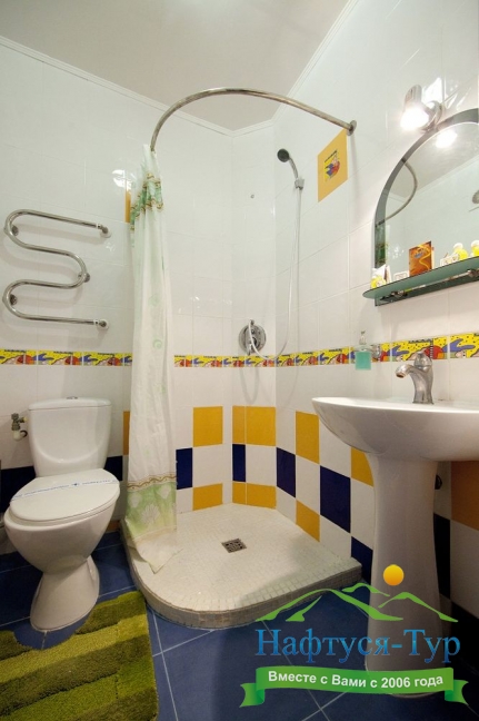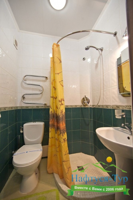 с душем (поддон), тапочки, туалетные принадлежности, фен, халат