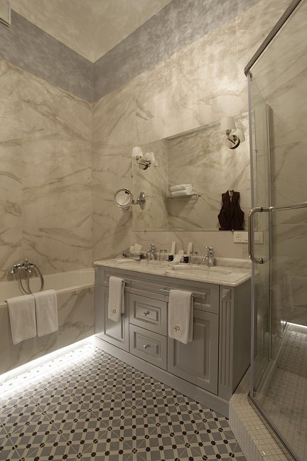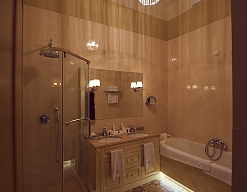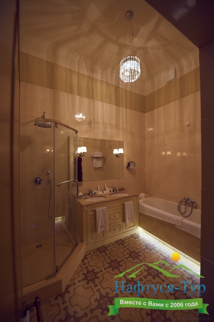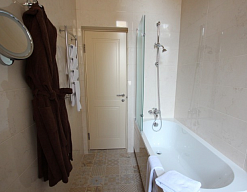 с ванной и душевой кабиной, тапочки, туалетные принадлежности, фен, халат