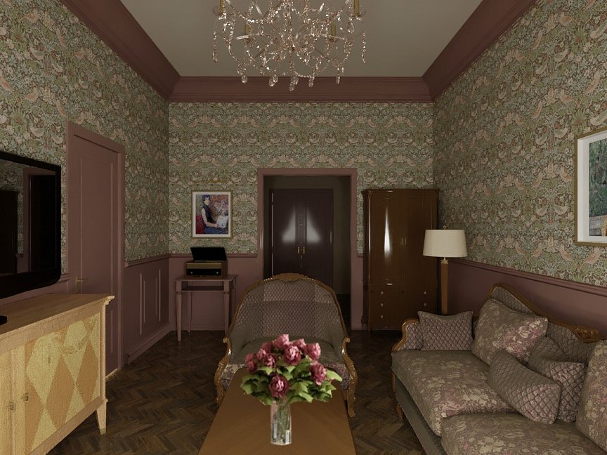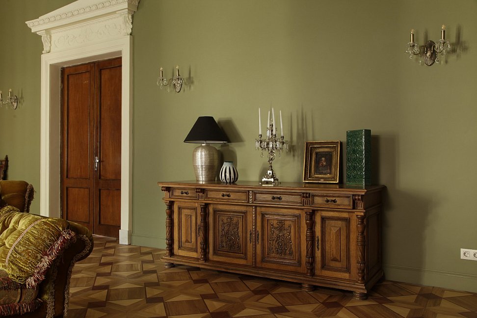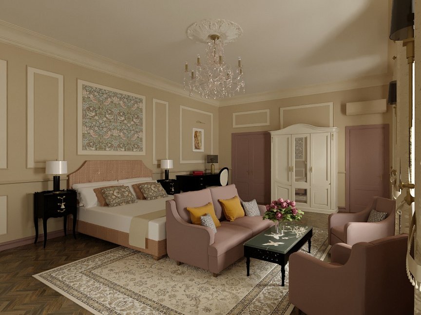 диван, зеркало, кровати односпальные /одна двуспальная кровать, прикроватные тумбочки, стол, стулья, тумба, шкаф