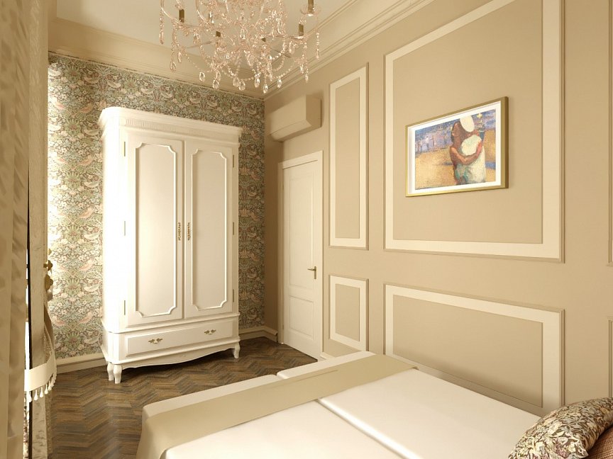 вешалка, диван раскладной, зеркало, кровати односпальные, кровать двуспальная, прикроватные тумбочки, стол, стулья, шкаф