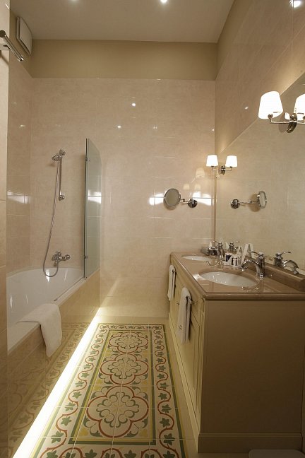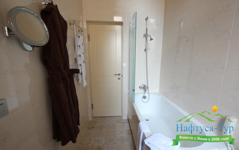 с ванной, тапочки, туалетные принадлежности, фен, халат