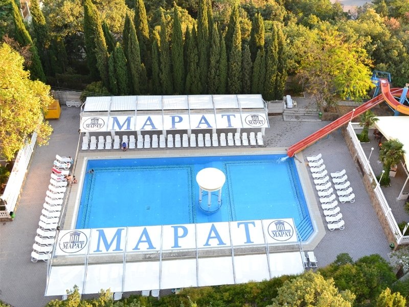 Корпус №1, корпус №2, Вилла "Чаир", столовая, киноконцертный комплекс и бассейн формируют единый отельный комплекс "Марат". Отельный комплекс расположен на ухоженной парковой закрытой территории 7,2 га, в непосредственной близости от уникального рукотворного парка "Чаир". Максимальная вместимость отеля - 1000 гостей.