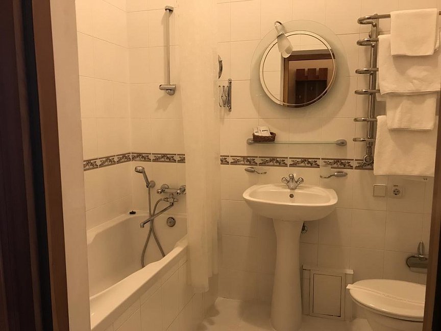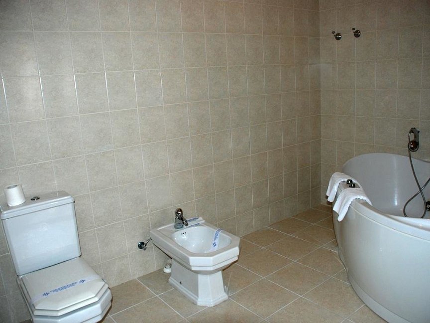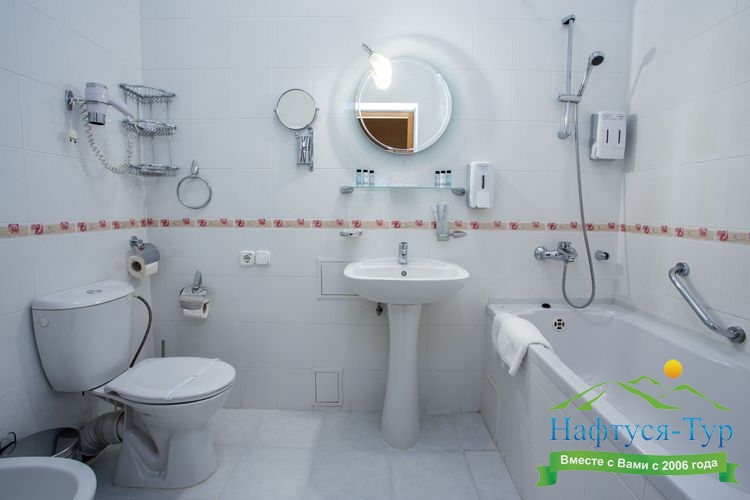 биде, с ванной, тапочки, туалетные принадлежности, фен, халат