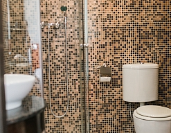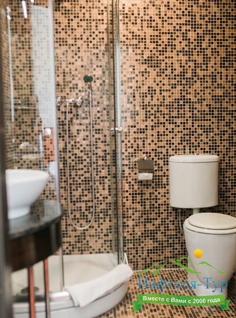 с ванной или душевой кабиной, тапочки, туалетные принадлежности, фен, халат