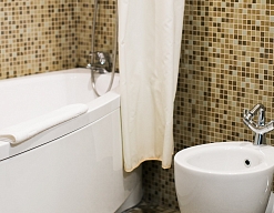 с ванной, тапочки, туалетные принадлежности, фен