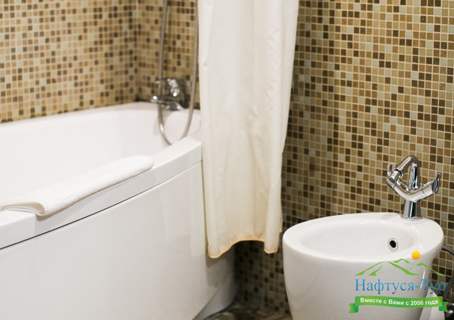 с ванной, тапочки, туалетные принадлежности, фен, халат