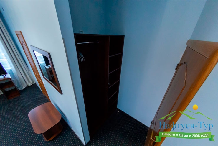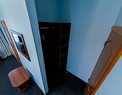 вешалка, зеркало, ковровое покрытие, кровать двуспальная, прикроватные тумбочки, стол, стул, шкаф