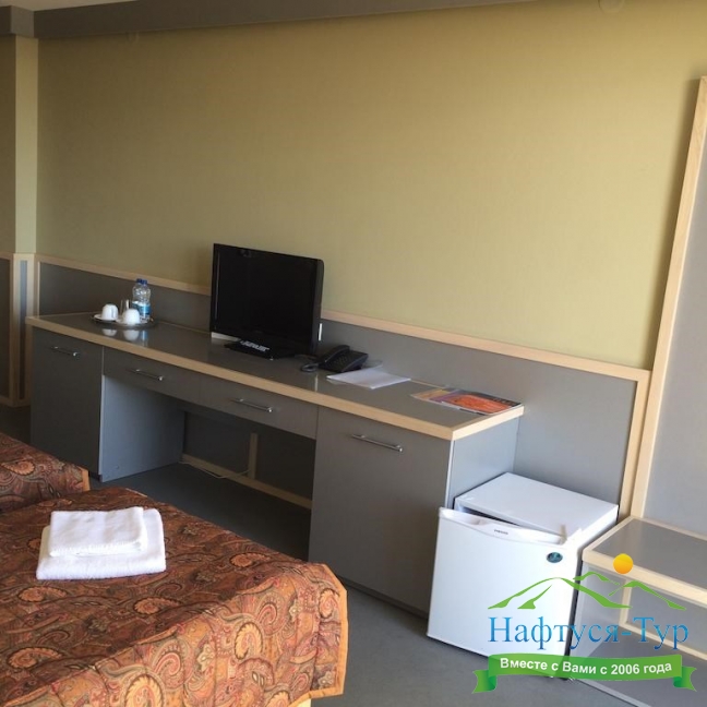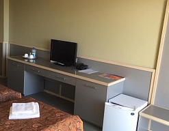 В номерах было всё необходимое : фен, чайник, тапочки, сейф, холодильник . Было очень большое количество мест для хранения.