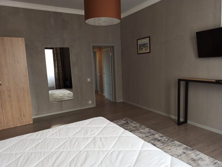вешалка, диван, зеркало, кровать двуспальная, прикроватные тумбочки, стол, стулья, тумба, шкаф