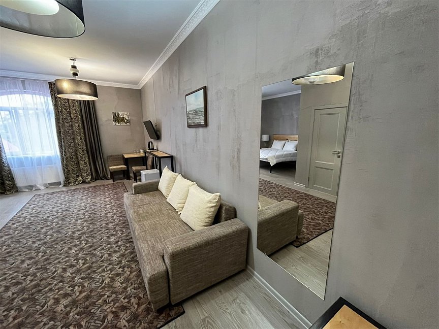 диван, зеркало, кровать двуспальная, прикроватные столики, стол, стул, шкаф