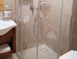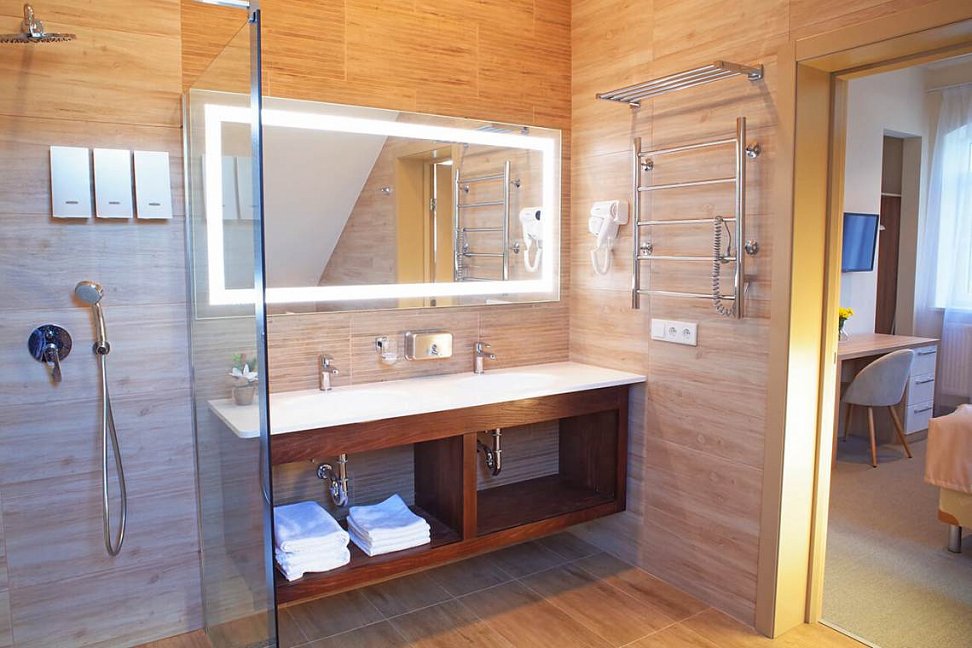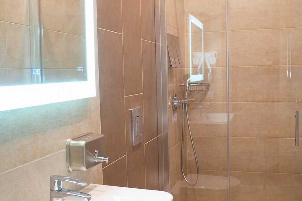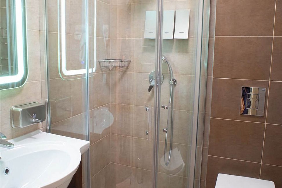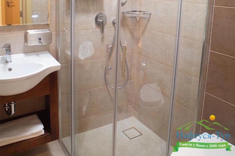 с душем, тапочки, туалетные принадлежности, фен, халат