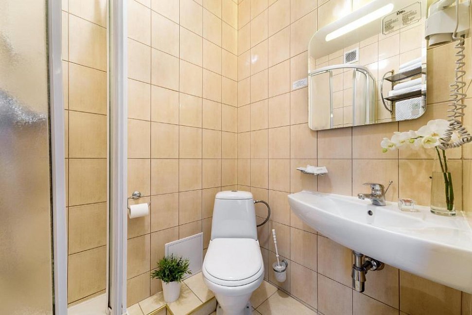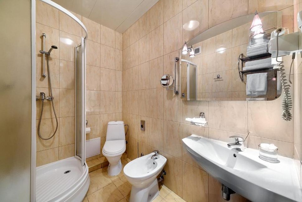 биде, с душевой кабиной, туалетные принадлежности, фен