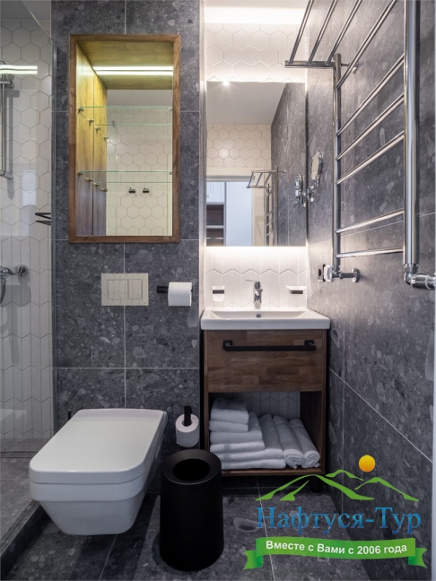 с душем, тапочки, туалетные принадлежности, фен, халат