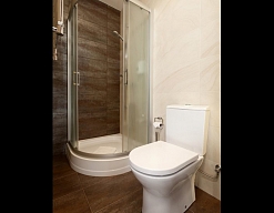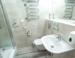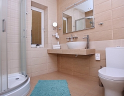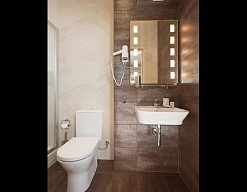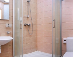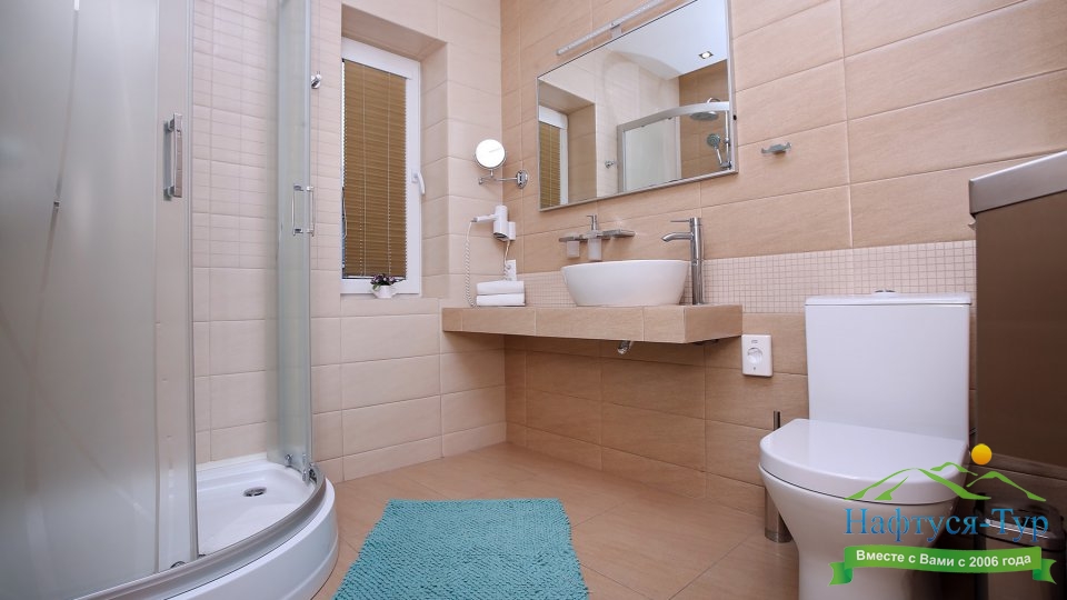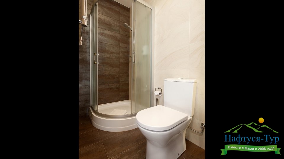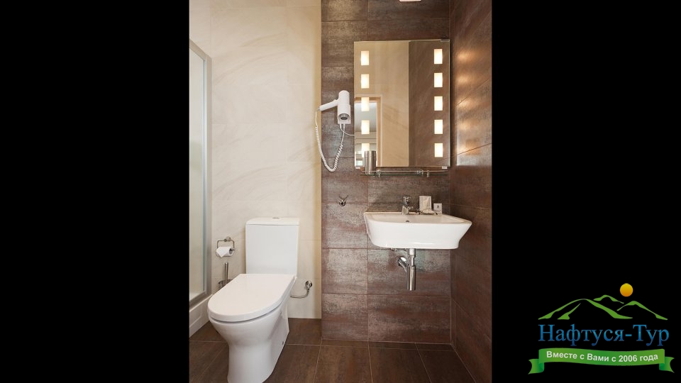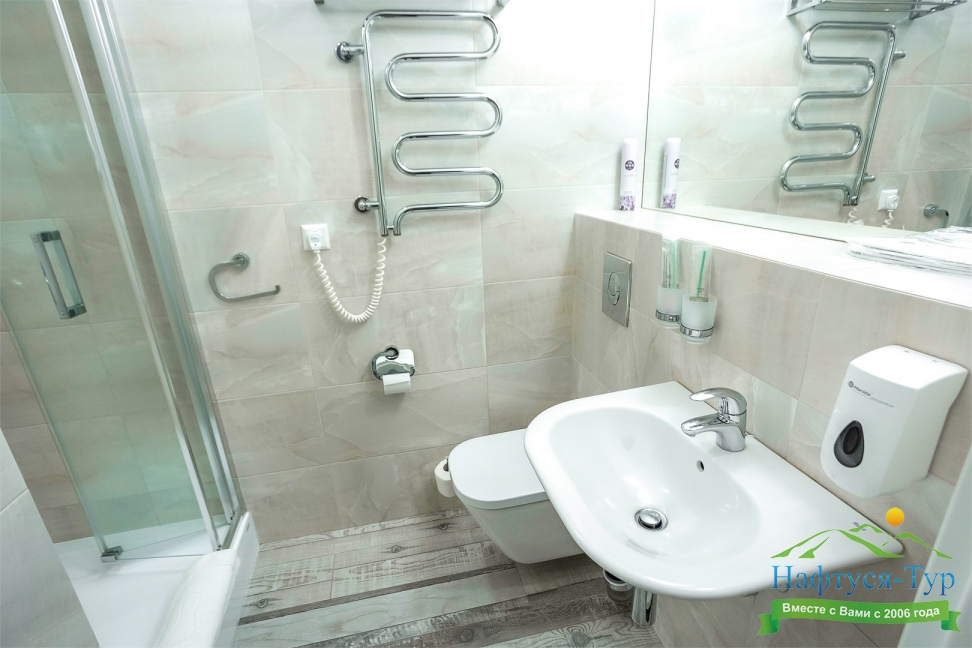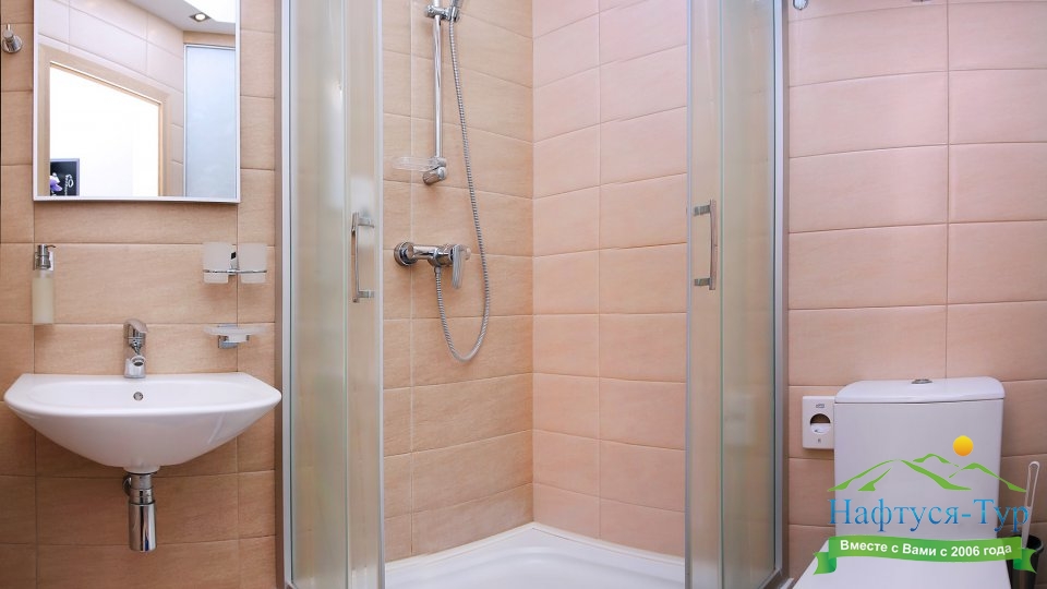 с душевой кабиной, тапочки, туалетные принадлежности, фен
