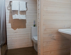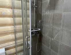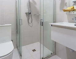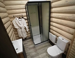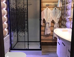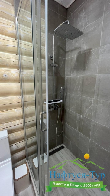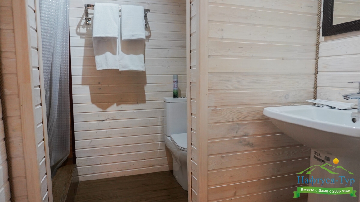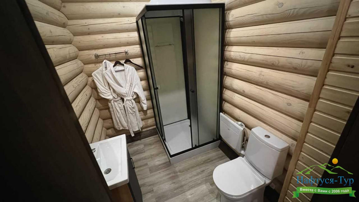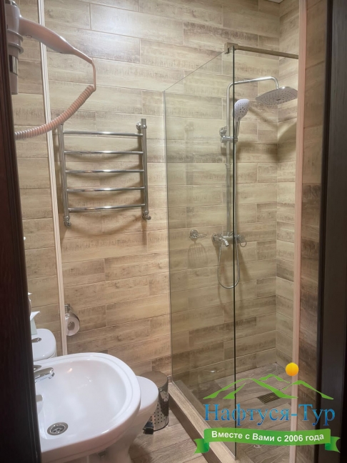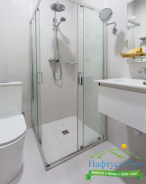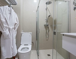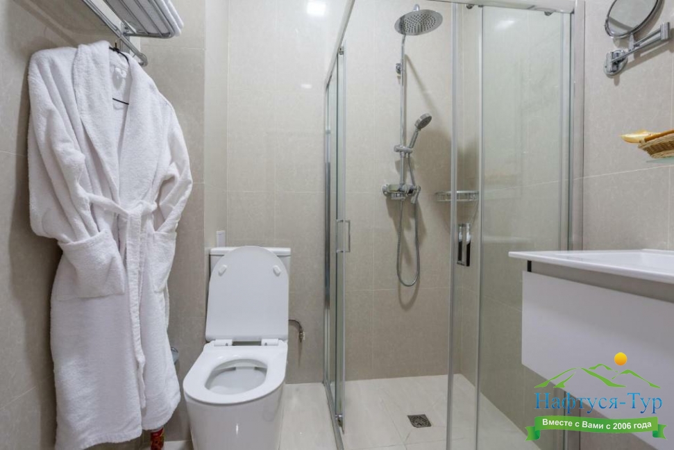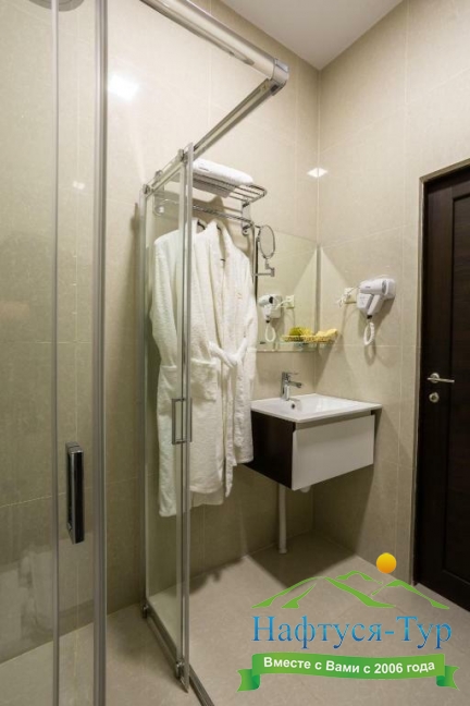 с душем, тапочки, туалетные принадлежности, фен, халат