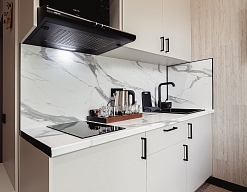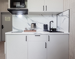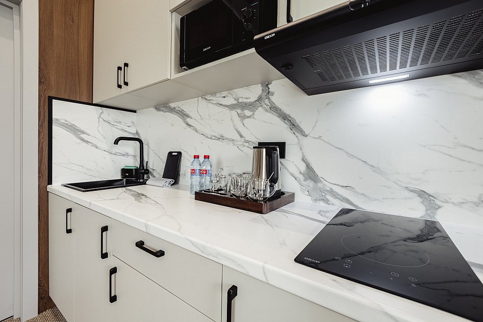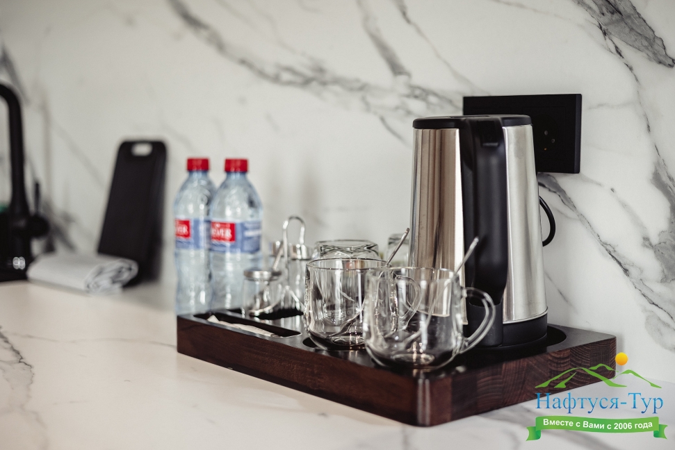 гладильная доска, кондиционер, микроволновая печь, мини-холодильник, набор посуды, плита электрическая, сейф, телевизор, теплый пол, утюг, чайник