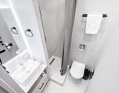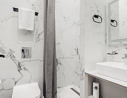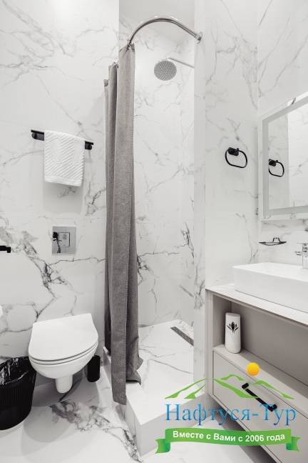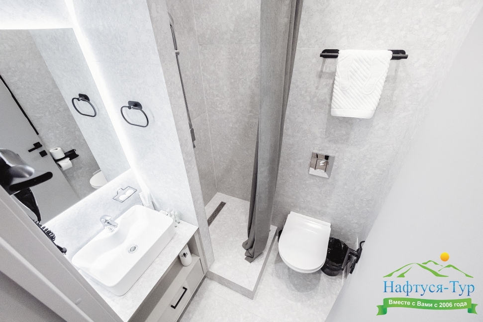 с ванной или душевой кабиной, тапочки, теплый пол, туалетные принадлежности, халат