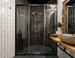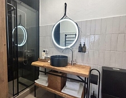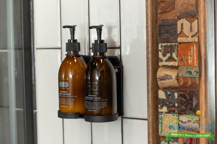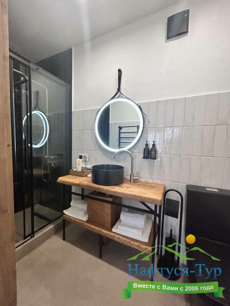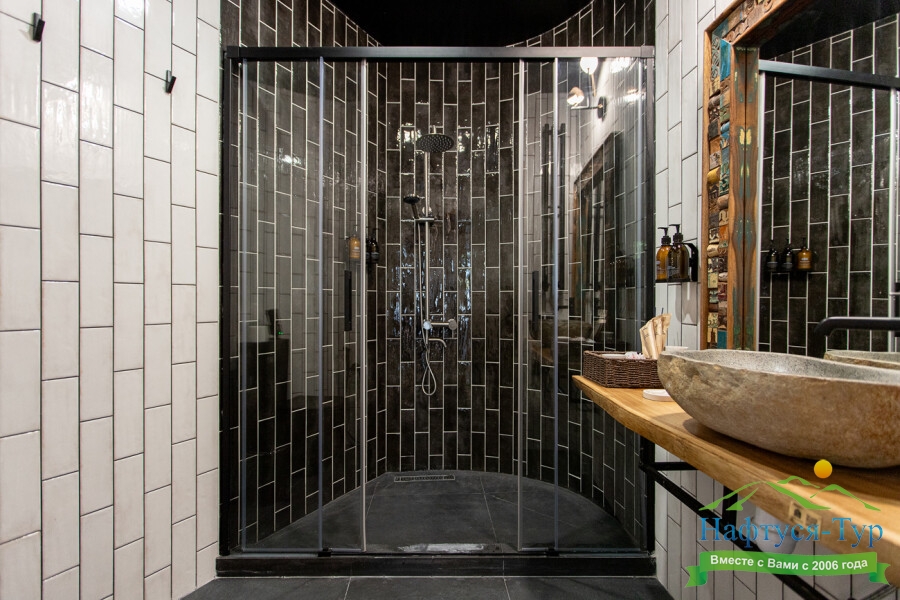 с душем, тапочки, туалетные принадлежности, фен, халат